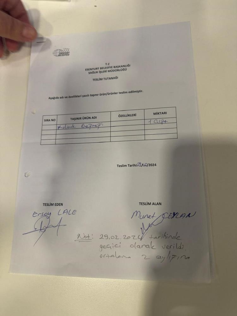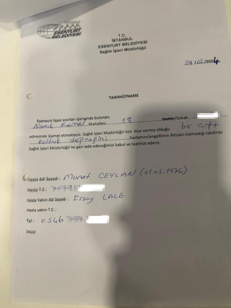 "Bahsi geçen olayda vatandaşımız, 2 medikal malzemeyi, 29 Şubat'ta 2 ay süreyle verildiğini beyan eden taahhütname karşılığında ilgili birimimizden teslim almıştır. 26 Kasım'da vatandaşımız aranarak, sağlık durumuyla ilgili bilgi alınmış ve medikal malzemelere ihtiyacı olup olmadığı sorulmuştur. Birimimize yürüyerek gelen vatandaşımız, kendisine sağlanan medikal malzemeyi, ihtiyacı olmadığı için kendi inisiyatifiyle teslim etmiştir. Bu rutin uygulama, vatandaşımızla yaptığımız telefon görüşme kayıtlarına ve güvenlik kamerası görüntülerine de yansımıştır."