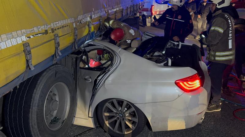 Otomobil sürücüsü, tırın altında kalan araçta sıkıştı.