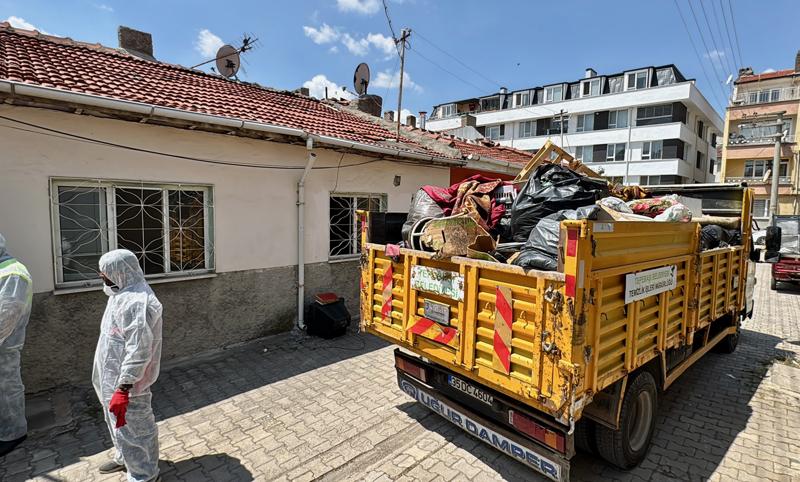 Temizlik İşleri Müdürlüğü ekipleri, evden teneke, pet şişe, plastik poşet ve çeşitli ambalaj atıkları ile plastik eşyalardan oluşan 2 kamyon çöp çıkardı. Çıkarılan atıklar, imha edilmek üzere katı atık bertaraf tesisine götürüldü.
