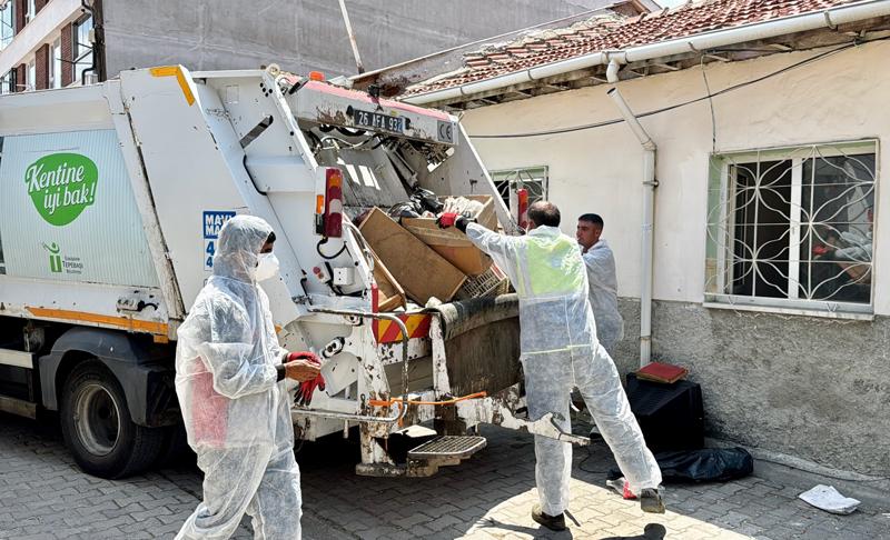 Temizlik İşleri Müdürlüğü ekipleri, evden teneke, pet şişe, plastik poşet ve çeşitli ambalaj atıkları ile plastik eşyalardan oluşan 2 kamyon çöp çıkardı. Çıkarılan atıklar, imha edilmek üzere katı atık bertaraf tesisine götürüldü.