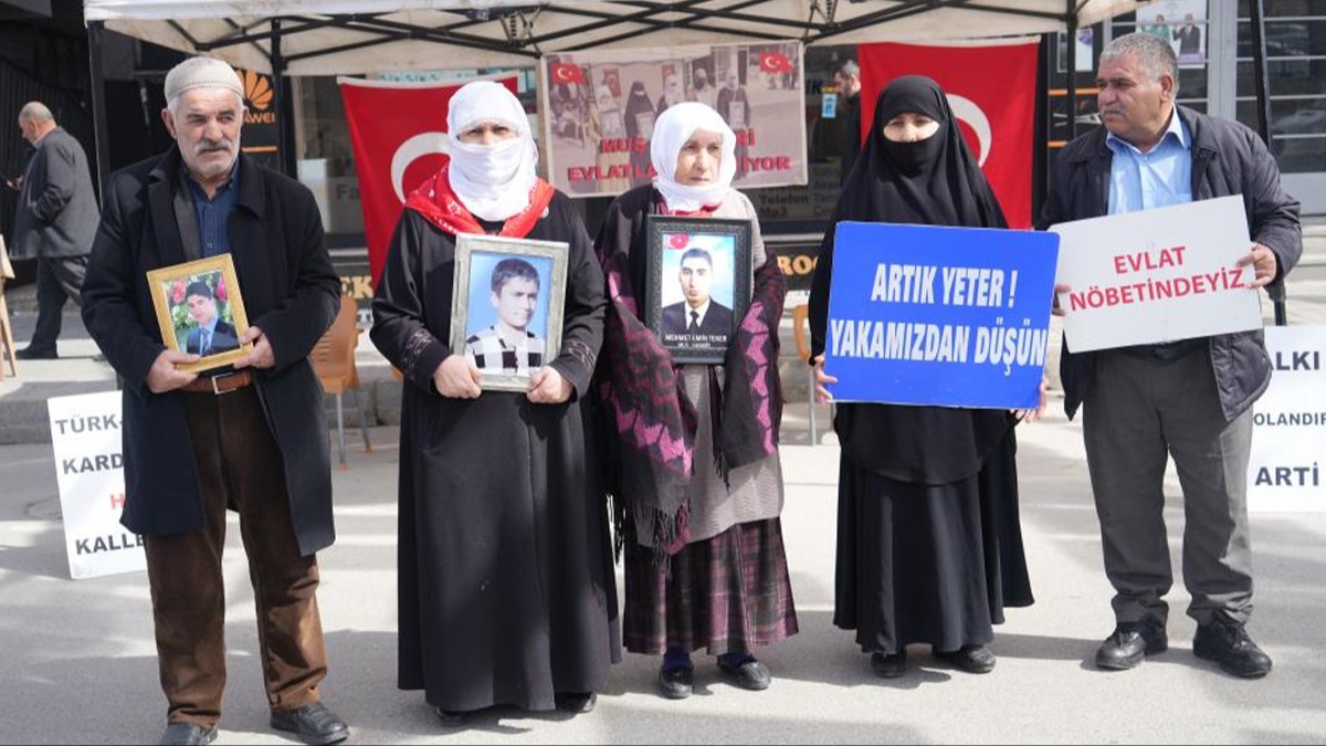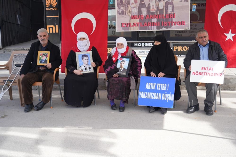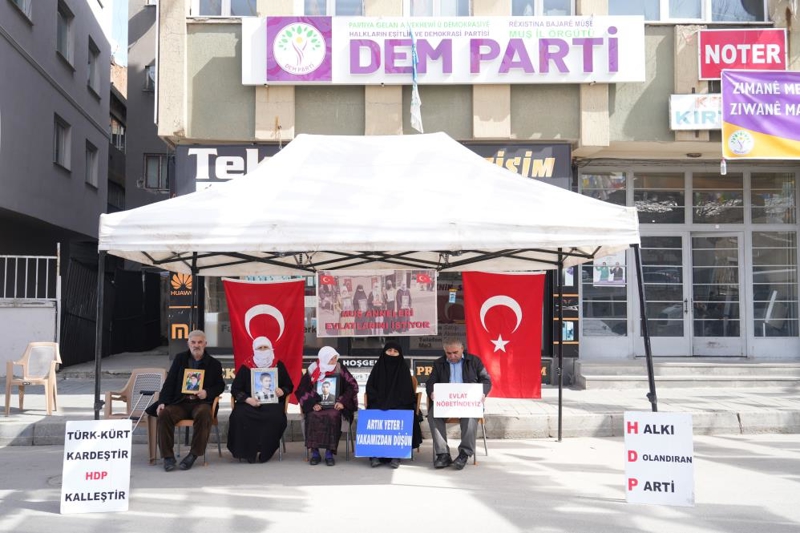 Muş'ta çocukları terör örgütü PKK tarafından kaçırılan aileler, DEM Parti il binası önündeki oturma eylemini sürdürüyor. Aileler, çocuklarının en kısa sürede güvenli bir şekilde evlerine dönmesini beklerken, toplumun da bu konuda destek olmasını istedi. Çocuklarına kavuşmak ümidiyle her hafta çarşamba günü DEM Parti il binası önünde bir araya gelen aileler, "Evlat nöbetindeyiz", "Anneler direniyor" ve "Artık yeter yakamızdan düşün" yazılı pankartlar açtı. Ellerinden fotoğraflarını düşürmedikleri çocuklarına "teslim ol" çağrısında bulunan anne ve babalar, eylemin yapıldığı yoldan geçen ve yüksek sesle müzik açan DEM Parti'nin seçim aracına tepki gösterdi.