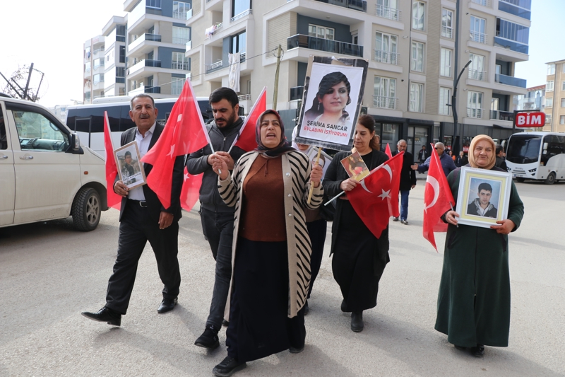 Eyleme katılan Nazlı Sancar, 12 yıldır kızından haber alamadığını belirterek, "Yıllardır bu haklı mücadelemi yürütüyorum, sonsuza kadar da devam edeceğim. Evlatlarımız kurtulana kadar bu kapıdan ayrılmayacağız. Verdiğimiz mücadelemiz sonucu şu ana kadar 68 evladımızı terörün pençesinden kurtardık. Allah'ın izniyle, devletimizin gücüyle bizim emeğimiz ve mücadelemiz boşa gitmiyor. Müzikle bizim sesimizi bastıramazlar. Biz düşmanın karşısında boynumuzu eğmiyoruz. Biz evlatlarımızı söke söke PKK'dan alacağız. Biz burada hakkımız olan evlatlarımızı istiyoruz. Bizim çocuklarımızı neden dağlarda, mağaralarda öldürtüyorlar? Kendi çocukları niye ölmüyor? Çocuklarımızın elindeki kalemi kırıp silah verdiler. O kalem bizim çocuklarımızın eline yakışıyor, silah da onların çocuklarına. Bizim çocuklarımızı bırakıp, kendi çocuklarını dağlara, mağaralara göndersinler" dedi.