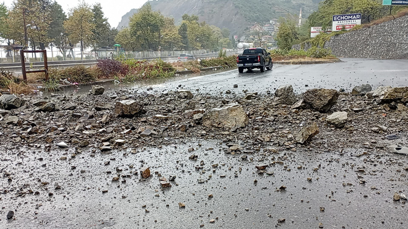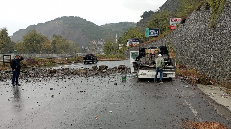 Karadeniz Ereğli-Alaplı kara yolu Göktepe mevkisinde özel firmaya ait 67 LB 903 plakalı kamyonetin sürücüsü İlker Koçdemir, park alanında kamyonlara yakıt ikmali yaptığı sırada yamaçtan kopan kayalar, aracın kaput kısmına isabet etti.