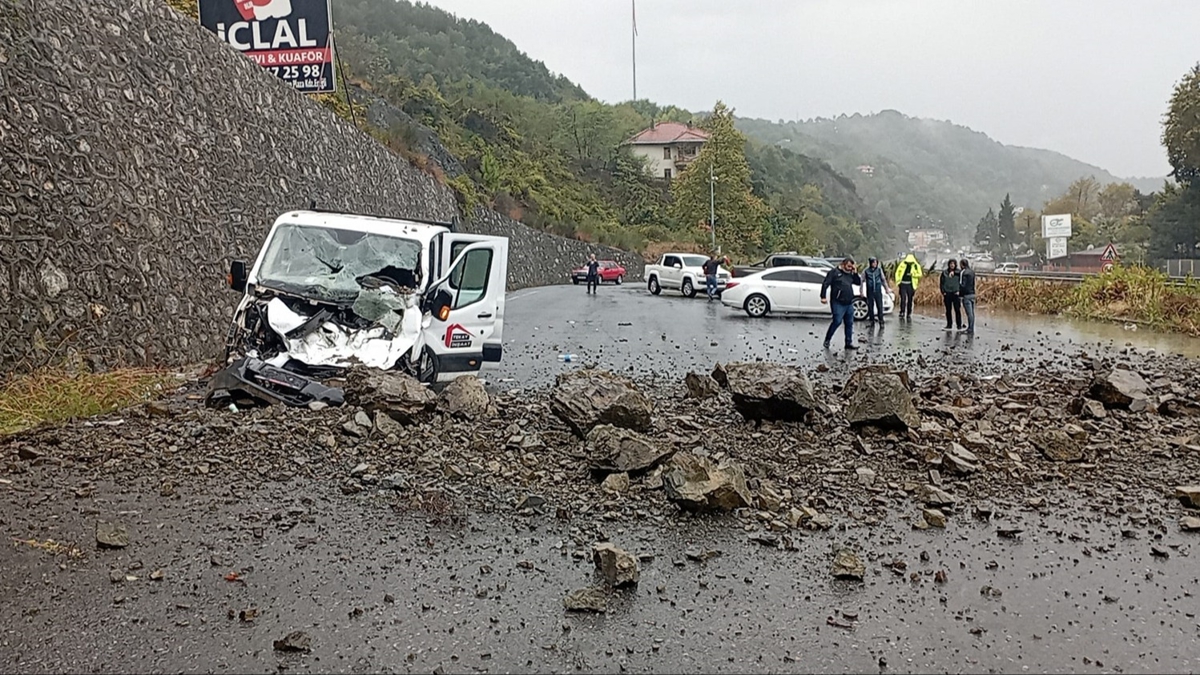 Zonguldak'ın Karadeniz Ereğli ilçesinde yamaçtan kopan kaya parçalarının isabet ettiği kamyonet kullanılamaz hale geldi.