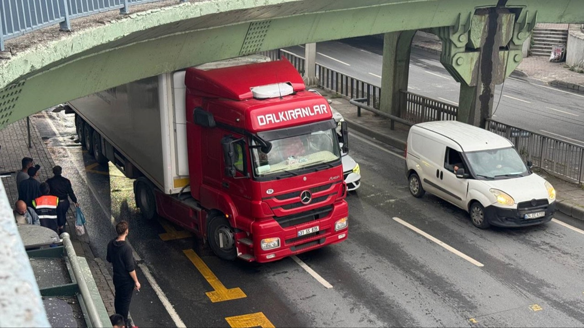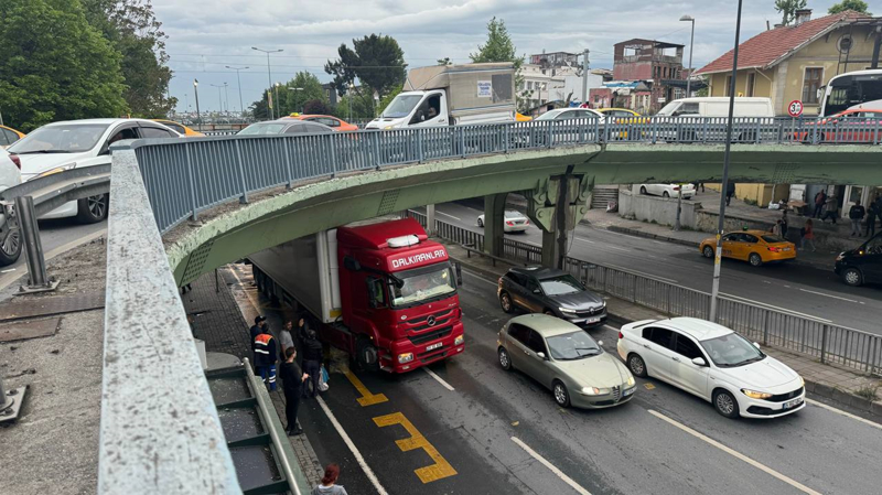 Kamyonun köprü altında sıkışması caddede trafik yoğunluğuna neden oldu.