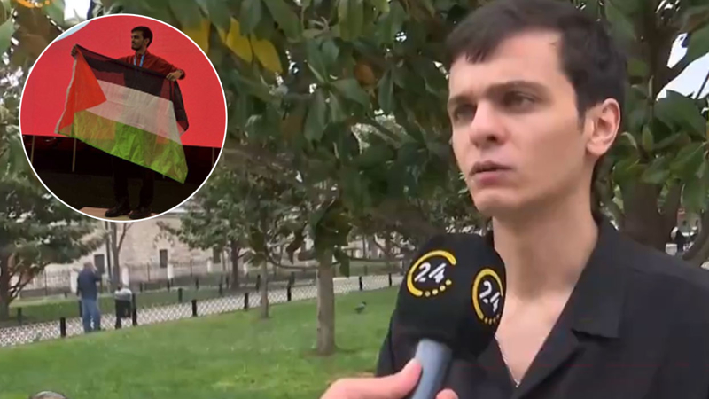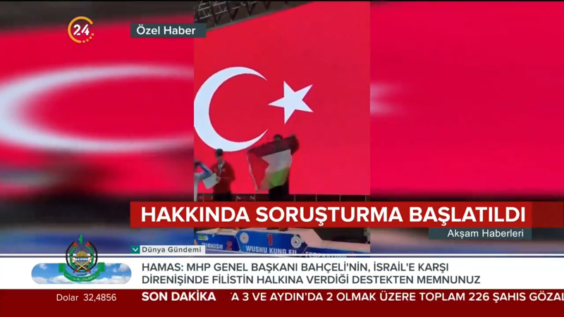 Akyüz, daha sonra kürsüde Filistin bayrağı açtı ve Filistin halk oyunu 'dabke' dansı yaptı.
