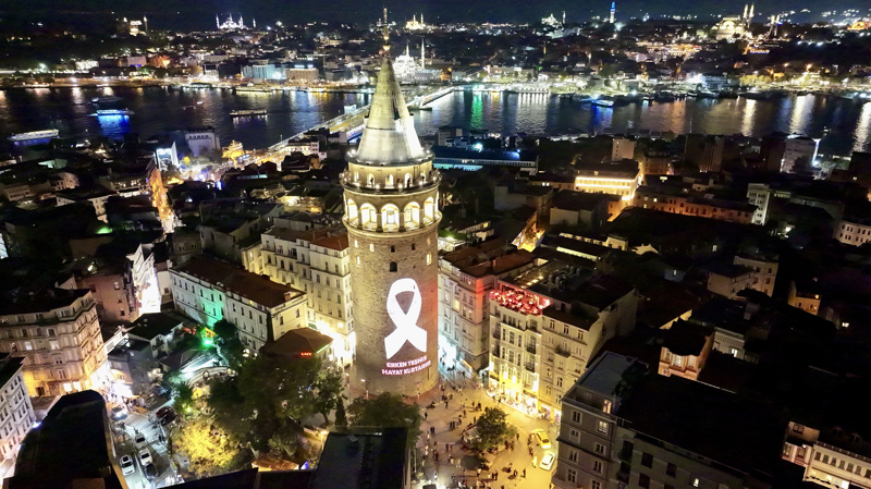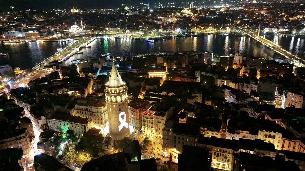 Kültür ve Turizm Bakanlığınca "Meme Kanseri Farkındalık Ayı" kapsamında Galata Kulesi'ne pembe kurdele yansıtıldı.