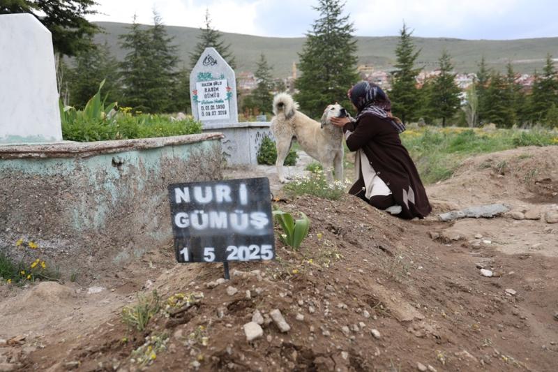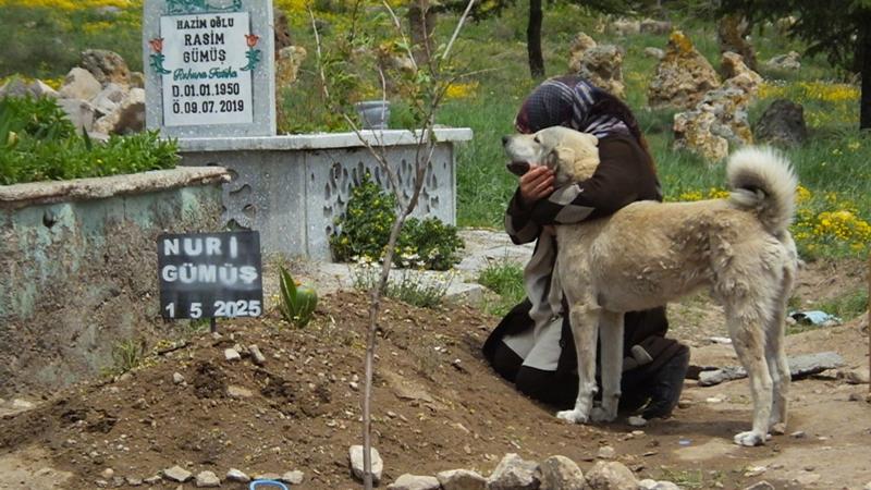 Gümüş'ün 5 yıl önce yavruyken sahiplendiği köpeği "Garip", defin işleminin ardından mezarın başından ayrılmadı.