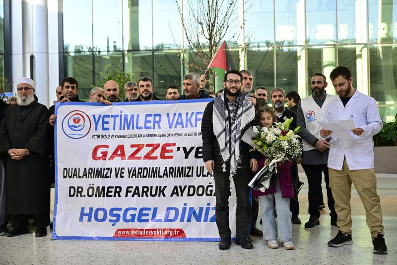 Gazze'den dönen Aydoğan, İstanbul Havalimanı'nda Yetimler Vakfı üyeleri tarafından çiçeklerle karşılandı.