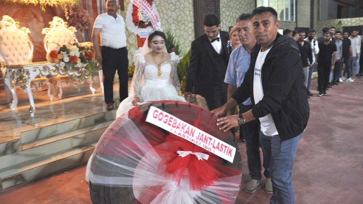 Çifte, araç lastiği hediye eden Göğebakan da "Arkadaşımıza düğün hediyesi olarak altın yerine kara altın (kara lastik) getirdim. Allah hayırlı, uğurlu etsin inşallah. Güzel günlerde kullansın." diye konuştu.