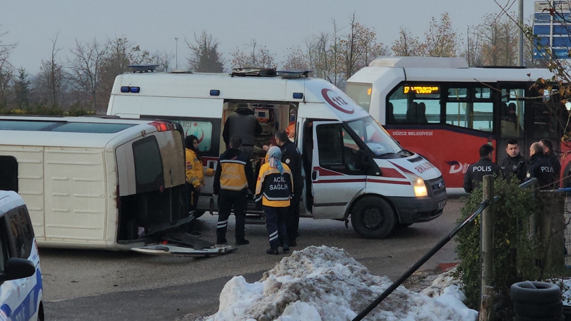 Kaza, saat 07.00 sıralarında Bahçeşehir 1'inci Düzce Bulvarı kavşağında meydana geldi. Şehir merkezine doğru giden Ayhan Yıldız idaresindeki 81 ABM 264 plakalı işçi servis minibüsü, yoldaki buzlanma nedeniyle kontrolden çıkıp devrildi. Kazada, minibüsteki 7 kişi yaralandı. İhbar üzerine kaza yerine sevk edilen ambulans da gizli buzlanma nedeniyle refüje çıktı. Bunun üzerine olay yerine çağrılan destek ambulanslarla yaralılar çevre hastanelere kaldırılarak tedaviye alındı.