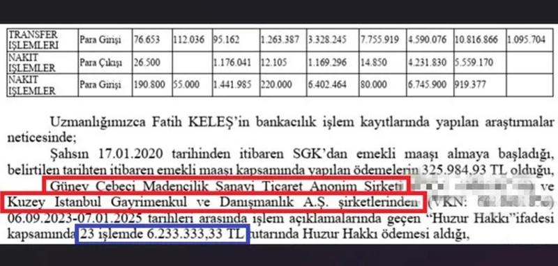 MASAK raporunda, ilgili şirketlerden Fatih Keleş'e 23 ayrı işlemde toplam 6.5 milyon TL ödeme yapıldığı ortaya çıktı.