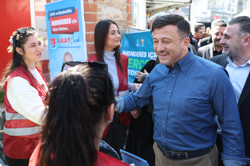 Hamza Dağ, Menderes ilçesindeki pazar yerini de ziyaret etti. Kalabalık bir grup tarafından karşılanan Dağ, burada CHP broşürlerini dağıtan kadınlarla da tokalaştı.