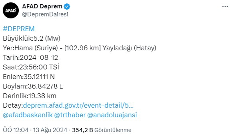 Suriye'nin Hama kentinde saat 23.56'da 5,2 büyüklüğünde deprem meydana geldi. Depremin merkez üssünün Hatay'ın Yayladağı ilçesine 102,96 kilometre uzaklıkta olduğu belirtildi.