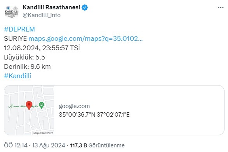 Kilis Valiliği'nin sosyal medya hesabından yapılan açıklamada da "Suriye Hama'da meydana gelen 5,2 büyüklüğündeki deprem ilimizde de hissedilmiştir. Deprem nedeniyle ilimizde can ve mal kaybımız bulunmamaktadır. Ekiplerimiz sahada incelemelere devam etmektedir. Tüm vatandaşlarımıza geçmiş olsun dileriz." ifadeleri kullanıldı.