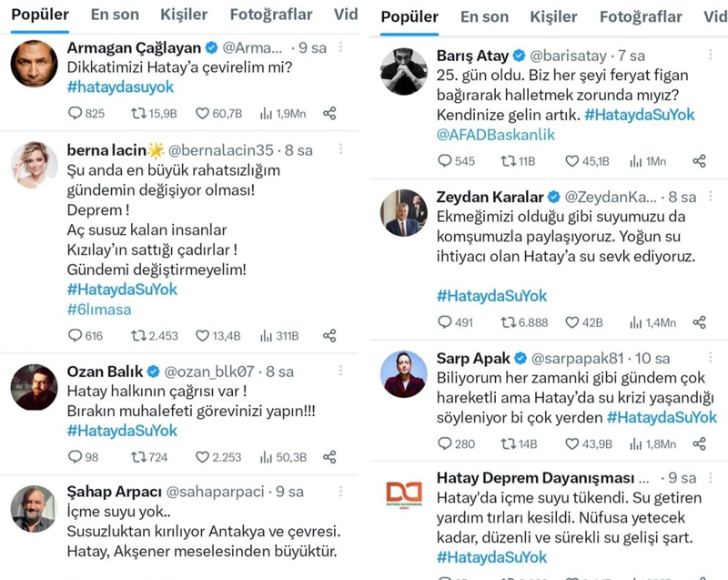 Sosyal medyada deprem süreci boyunca asılsız paylaşımlar yapan hesaplar, şimdi de 'Hatay'da içme suyu yok' şeklinde bir provokasyona soyundu. Birçok asılsız ihbarı paylaşarak ekiplerin zaman kaybetmesine neden olan, 'Baraj patladı' yalanını yayarak bölgede infiale neden olan hesapların 'su yok' paylaşımlarında birleşmesi de dikkat çekti.