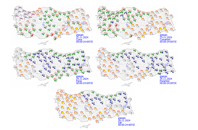 YÜKSEK NOKTALARDA KAR YAĞIŞI ETKİLİ OLACAKYağışların genellikle yağmur ve sağanak, Kıyı Ege ile Batı Akdeniz kıyılarında yer yer gök gürültülü sağanak, Marmara'nın güneybatısı, Batı Karadeniz'in iç kesimleri ile akşam saatlerinden sonra iç bölgelerin yükseklerinde karla karışık yağmur ve kar şeklinde olması bekleniyor.