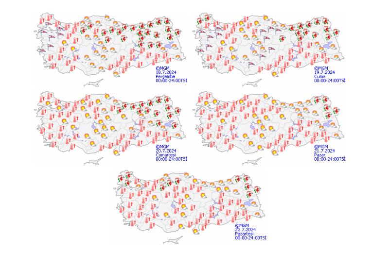 Yurdun kuzey, iç ve doğu kesimlerinin parçalı, yer yer çok bulutlu, Akdeniz'in Toroslar kesimi, Doğu Karadeniz, Doğu Anadolu'nun kuzeyi ile Kayseri'nin doğu kesimleri, Bolu, Karabük, Sivas, Samsun, Amasya'nın doğusu ve Ordu çevrelerinin yerel olmak üzere sağanak ve gök gürültülü sağanak yağışlı, diğer yerlerin az bulutlu ve açık geçeceği tahmin ediliyor. Yağışların Doğu Karadeniz ile Doğu Anadolu'nun kuzeyinde yer yer kuvvetli olması bekleniyor. Ülkemizin güneydoğu kesimlerinde toz taşınımı bekleniyor.