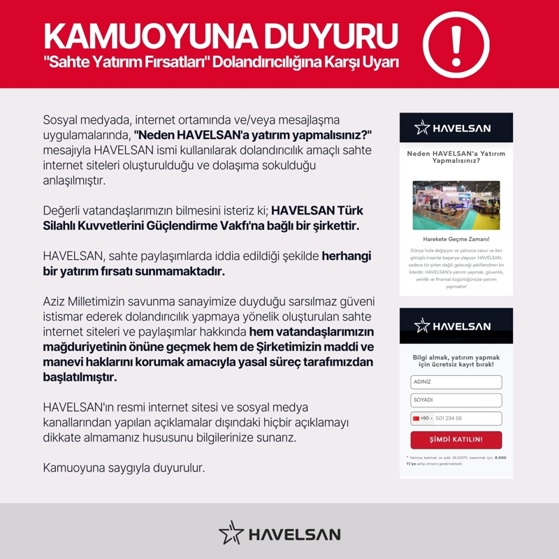 "Sosyal medyada, internet ortamında ve/veya mesajlaşma uygulamalarında, 'Neden HAVELSAN'a yatırım yapmalısınız?' mesajıyla HAVELSAN ismi kullanılarak dolandırıcılık amaçlı sahte internet siteleri oluşturulduğu ve dolaşıma sokulduğu anlaşılmıştır. Değerli vatandaşlarımızın bilmesini isteriz ki; HAVELSAN Türk Silahlı Kuvvetlerini Güçlendirme Vakfı'na bağlı bir şirkettir. HAVELSAN, sahte paylaşımlarda iddia edildiği şekilde herhangi bir yatırım fırsatı sunmamaktadır. Aziz Milletimizin savunma sanayimize duyduğu sarsılmaz güveni istismar ederek dolandırıcılık yapmaya yönelik oluşturulan sahte internet siteleri ve paylaşımlar hakkında hem vatandaşlarımızın mağduriyetinin önüne geçmek hem de şirketimizin maddi ve manevi haklarını korumak amacıyla yasal süreç tarafımızdan başlatılmıştır. HAVELSAN'ın resmi internet sitesi ve sosyal medya kanallarından yapılan açıklamalar dışındaki hiçbir açıklamayı dikkate almamanız hususunu bilgilerinize sunarız."