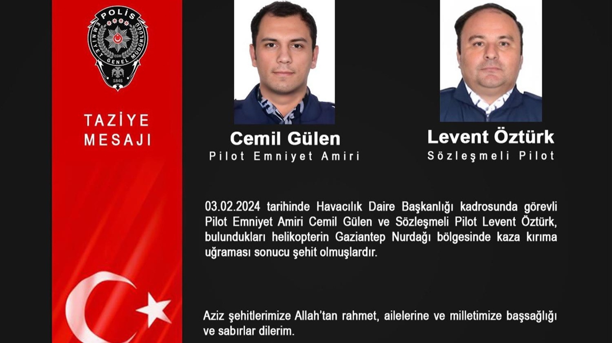 Emniyet Genel Müdürlüğünden yapılan açıklamada, "03.02.2024 tarihinde Havacılık Daire Başkanlığı kadrosunda görevli Pilot Emniyet Amiri Cemil Gülen ve Sözleşmeli Pilot Levent Öztürk, bulundukları helikopterin Gaziantep Nurdağı bölgesinde kaza kırıma uğraması sonucu şehit olmuşlardır" ifadeleri kullanıldı.