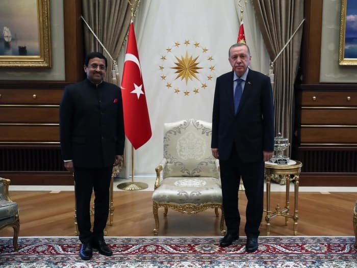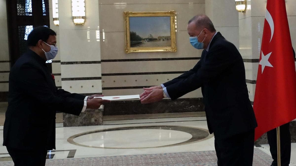 Cumhurbaşkanı Erdoğan, Cumhurbaşkanlığı Külliyesi'nde Hindistan Büyükelçisi Panda ile bir araya geldi. Panda, kabulde Cumhurbaşkanı Erdoğan'a güven mektubu sundu. Öte yandan güven mektubu sunumunda Cumhurbaşkanı Erdoğan ile Hindistan Büyükelçisi Panda'nın maske taktıkları ve sosyal mesafeye uydukları görüldü. Ziyaret, fotoğraf çekimi ile sona erdi.