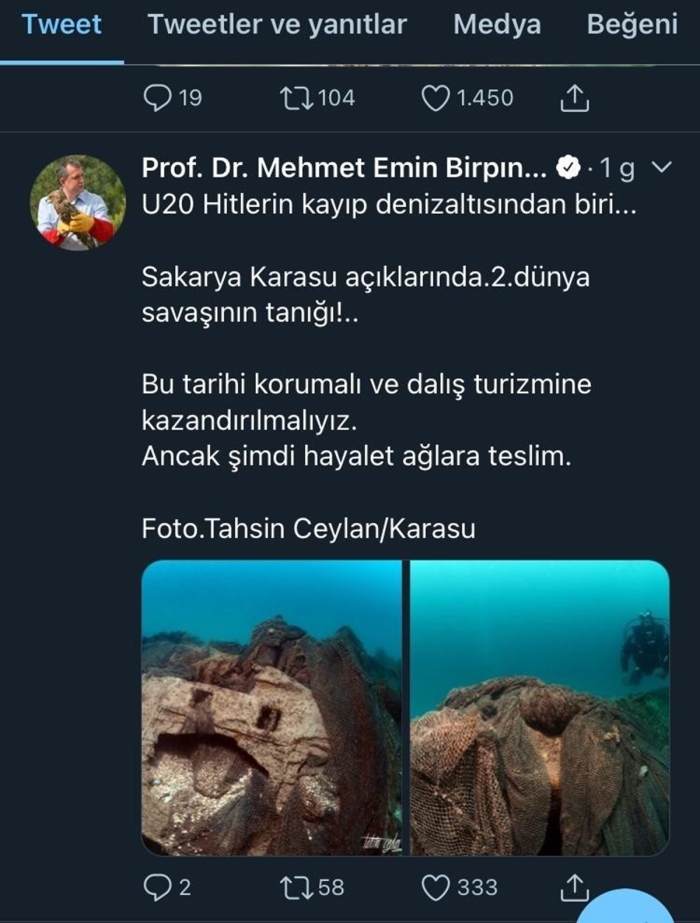 İkinci Dünya Savaşı’nda Nazi lideri Adolf Hitler’in talimatıyla Tuna Nehri’nden Karadeniz’e indirilen 6 denizaltılık filodaki U20 denizaltısı, 1944 yılında yine Hitler’in talimatıyla mürettebat tarafından batırıldı. Sakarya’nın Karasu ilçesi sahilinden 2 buçuk kilometre açıkta bulunan denizaltı, hayalet ağ olarak bilinen balıkçı ağlarıyla kaplandı. Çevre ve Şehircilik Bakan Yardımcısı Prof. Dr. Mehmet Emin Birpınar, Türkiye Sualtı Sporları Federasyonu Çevre Kurulu Başkanı Tahsin Ceylan tarafından çekilen görüntüleri paylaşarak, "Bu tarihi korumalı ve dalış turizmine kazandırmalıyız. Ancak şimdi hayalet ağlara teslim" ifadelerini paylaşmıştı.