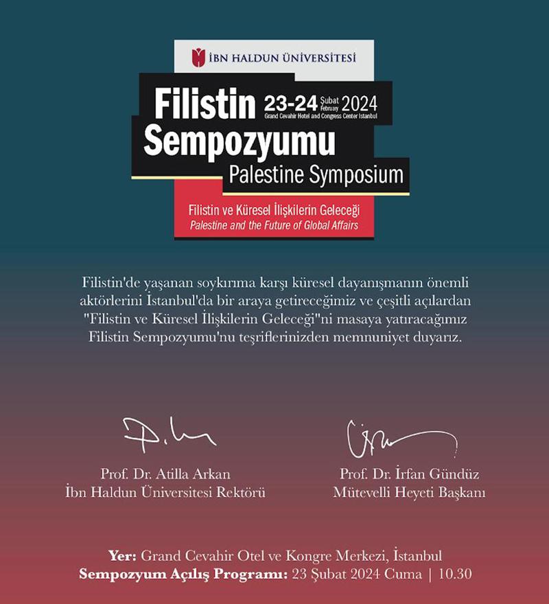 Uluslararası Filistin Sempozyumu 23-24 Şubat'ta "Filistin ve Küresel İlişkilerin Geleceği" temasıyla yapılacak. Sempozyumun açılışını İbn Haldun Üniversitesi mütevelli heyeti başkanı Prof. Dr. İrfan Gündüz ve başkan vekili Necmeddin Bilal Erdoğan gerçekleştirecek.