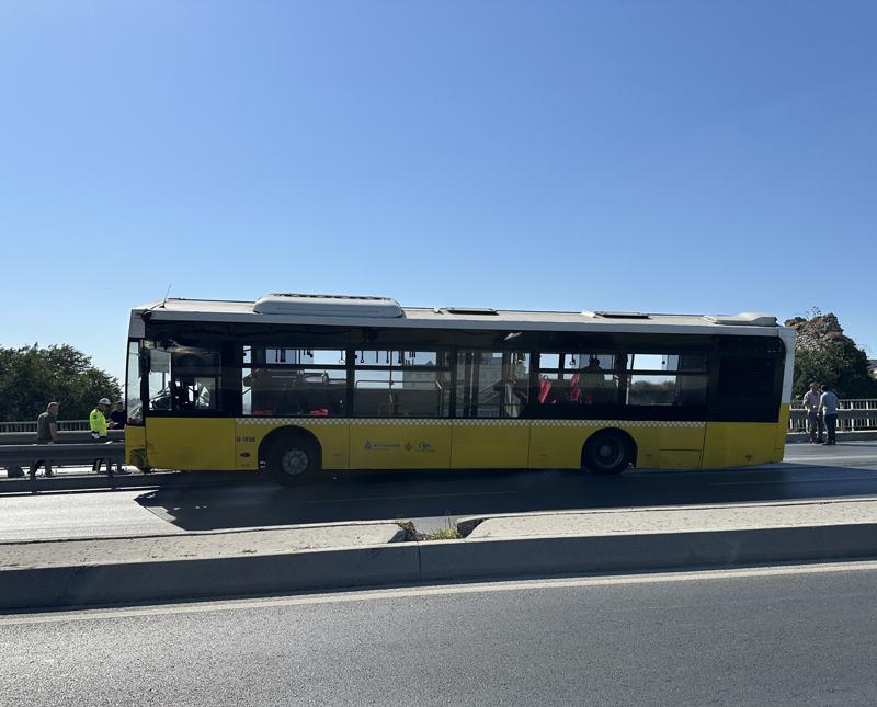 Yolun ortasındaki çelik bariyerlere de vuran otobüs, bariyerlerin üzerinde çıkarak asılı kalırken, otobüsün çarpmasıyla savrulan otomobil ise bariyerlere vurarak durabildi.