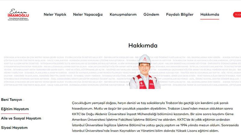 İmamoğlu'nun resmi sitesinde 'Eğitim Hayatım' bölümünde daha önce, "KKTC'de Doğu Akdeniz Üniversitesi İnşaat Mühendisliği bölümünü kazandım. Bir süre sonra kaydımı Girne Amerikan Üniversitesi İletişim Fakültesi İşletme Bölümü'ne aldırdım" kısmını "KKTC'de Doğu Akdeniz Üniversitesi İnşaat Mühendisliği bölümünü kazandım. Bir süre sonra kaydımı Girne Amerikan Üniversitesi İngilizce İşletme Bölümü'ne aldırdım" şeklinde değiştirdiği görüldü.