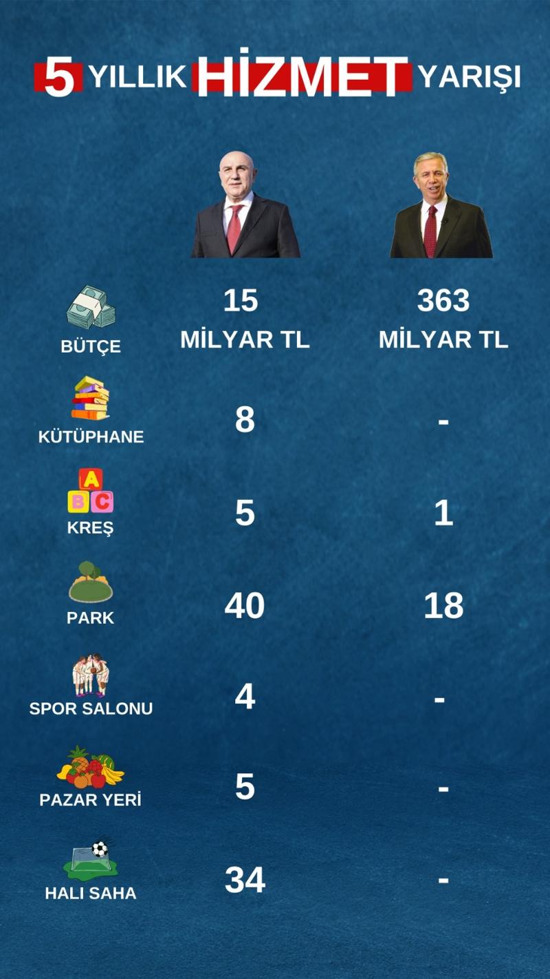 5 yılda toplam 363 milyar TL'lik devasa bütçe olanaklarını kullanan Altınok'un rakibi CHP'li aday Ankara Büyükşehir Belediye Başkanı Mansur Yavaş ise Ankara'nın nüfusu her yıl artmasına rağmen görev yaptığı dönemde Başkent'e sadece 18 park, 1 kreş yapabildi. Mansur Yavaş, 2019 yılından buyana Ankaralılar'a verdiği sözlerin hiçbirini tutmazken mevcut belediye hizmetlerinde de aksamalar meydana geldi. Ankara Büyükşehir Belediye Başkanı Mansur Yavaş'ın güncelleştirilmiş dolar kuru üzerinden 363 milyar TL'ye karşılık gelen dev bütçeyi nereye harcadığı ise tartışma konusu olmaya devam ediyor.