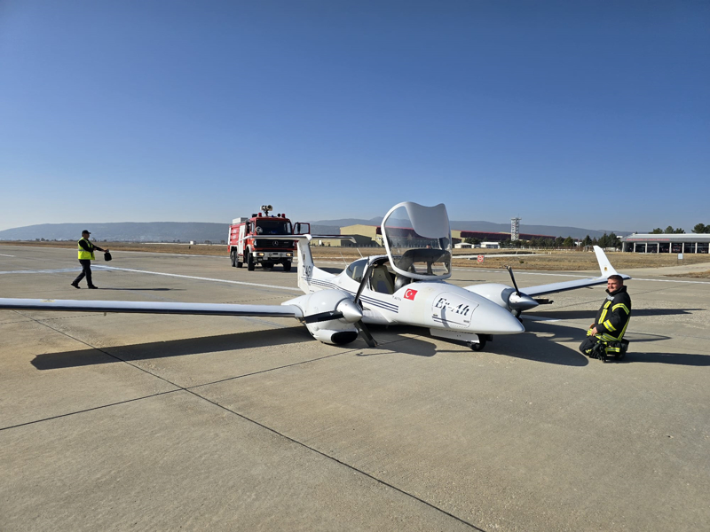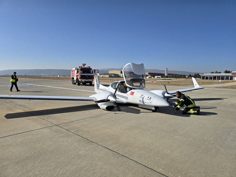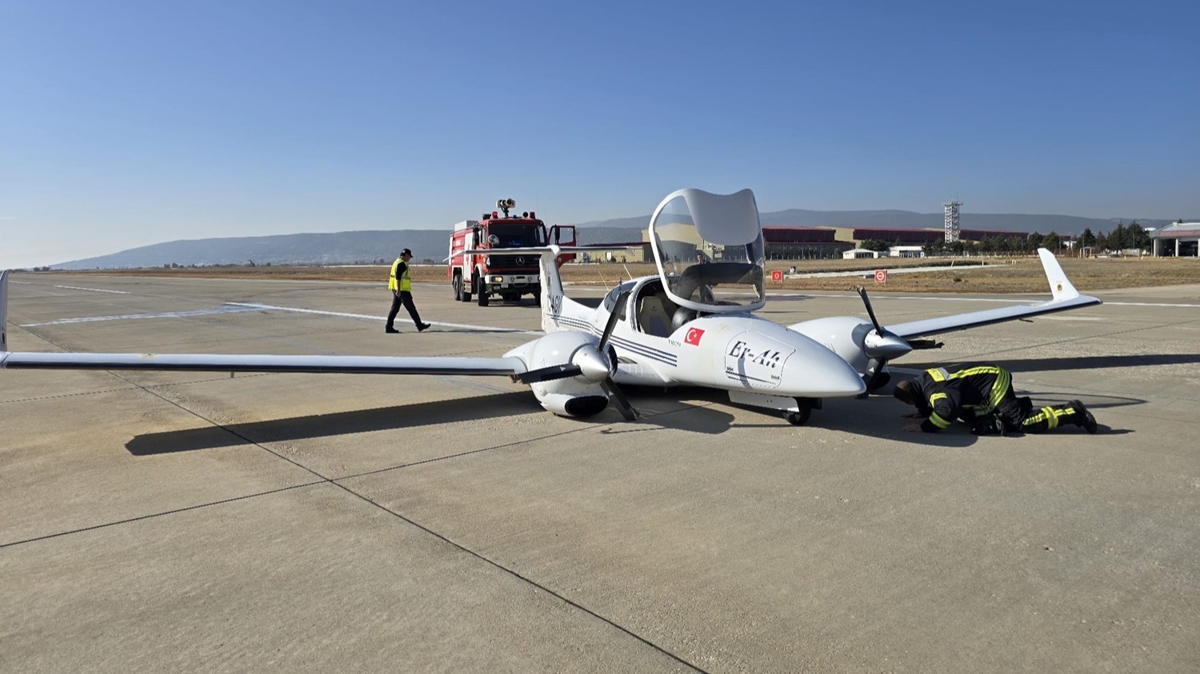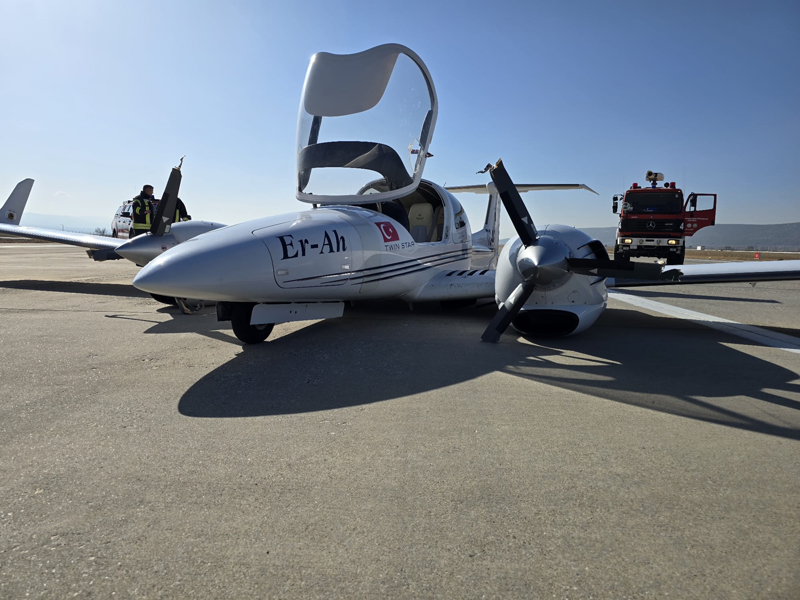 Pilot adayı öğrencinin bulunduğu çift motorlu Cessna tipi eğitim uçağının havalimanına inişi sırasında iniş takımları açılmadı.