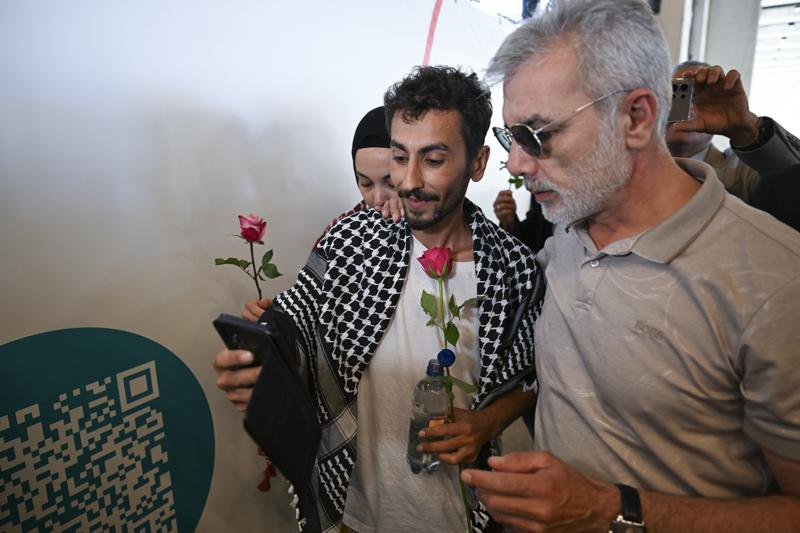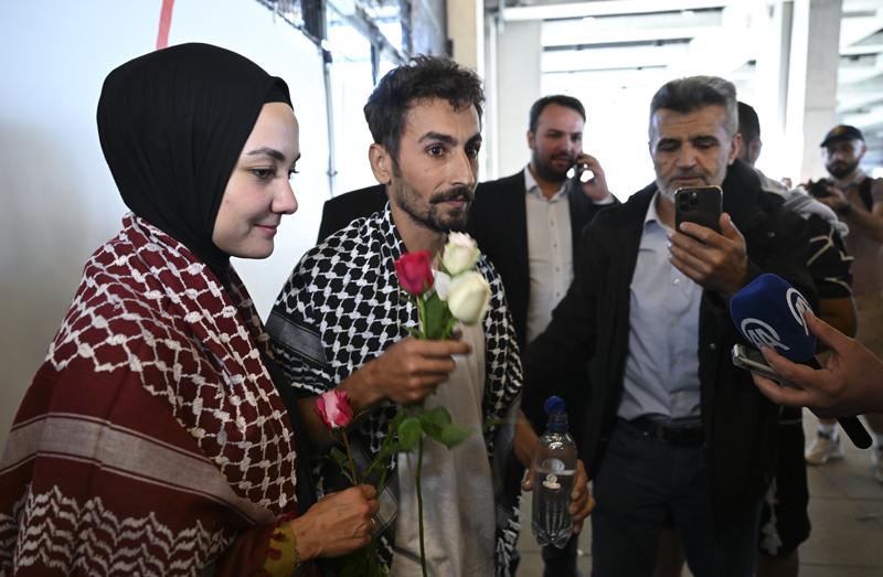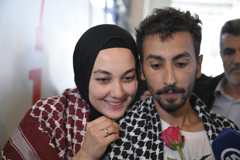 Şuayb Ordu, çıkışta eşine uzun süre sarılırken, Filistin destekçileri Ordu ve Acar'a çiçekler verip Filistin'e destek sloganları attı.