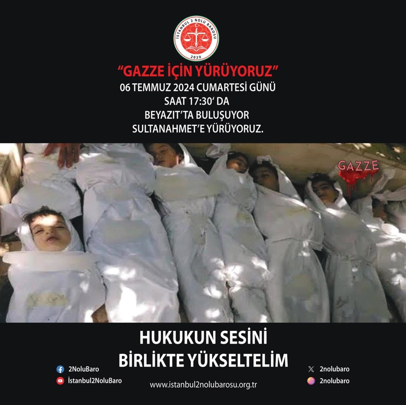İstanbul 2 Nolu Barosu işgalci İsrail saldırıları altındaki Gazze için yürüyüş düzenleyecek. Baro Başkanı Av. Yasin Şamlı tarafından yapılan açıklamada, 6 Temmuz 2024 Cumartesi günü saat 17:30'da Beyazıt Meydanı'nda buluşulacağı ve cübbelerle Sultanahmet Meydanı'na yürüneceği belirtildi.