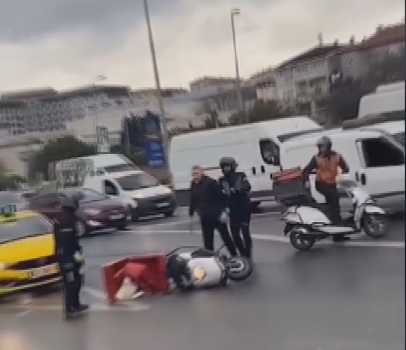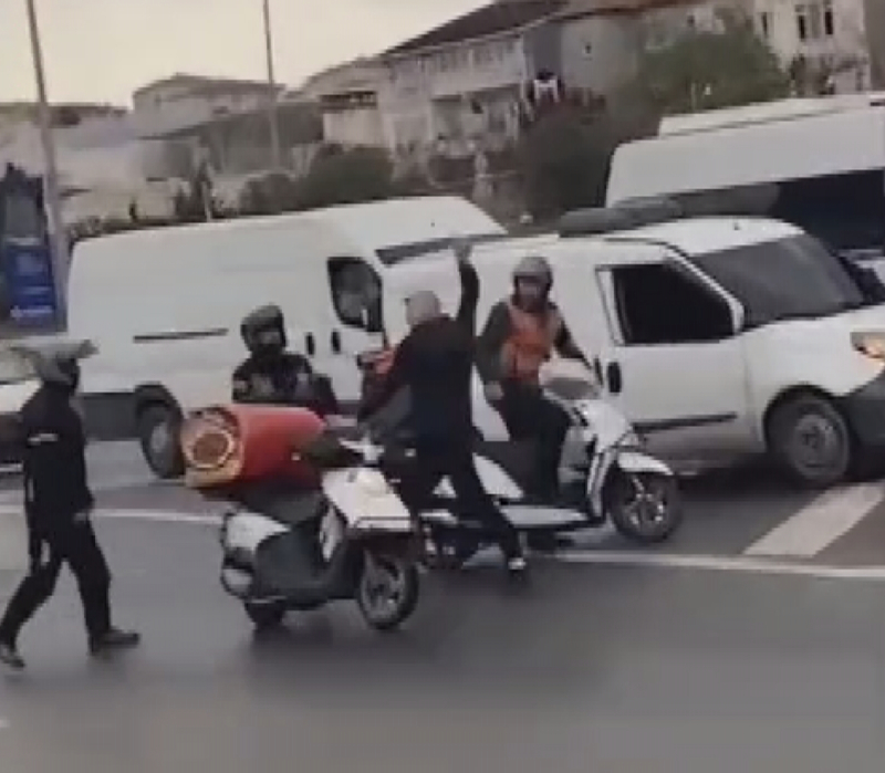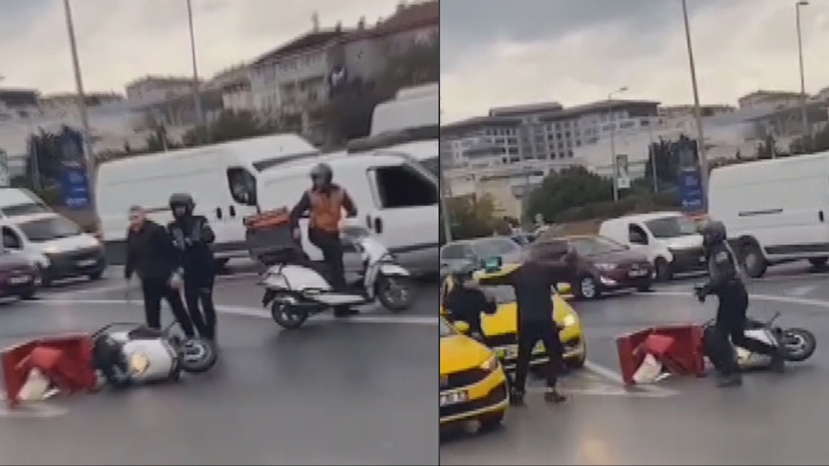 Trafikteki diğer kuryelerin araya girmesiyle uzaklaştırılan sürücü aracına binerek olay yerinden gitti. O anları trafikteki bir kişi cep telefonu kamerasıyla görüntüledi.