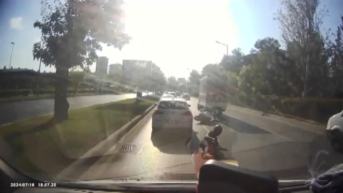 Kaza, geçtiğimiz Salı günü saat 18.15 sıralarında Bakırköy sahilyolunda meydana geldi. İddiaya göre, yolda ilerleyen otomobil ani fren yaptı. Otomobilin arkasında ilerleyen minibüs ise son anda durdu. Bu sırada, minibüsle kamyonet arasından geçmeye çalışan motosiklet sürücüsü, önce minibüse ardından da kamyonet ve otomobile çarptı. Çarpmanın etkisiyle yere düşen motosikletli, arasından geçmeye çalıştığı kamyonet ve otomobilin altında kalmaktan son anda kurtuldu. Sürücü çarpmanın etkisiyle yere düşerken, motosiklet metrelerce savruldu. Kaza sonrası, minibüs sürücüsü araçtan inerek motosikletliye yardım etti. O anlar araç kamerasına yansıdı.