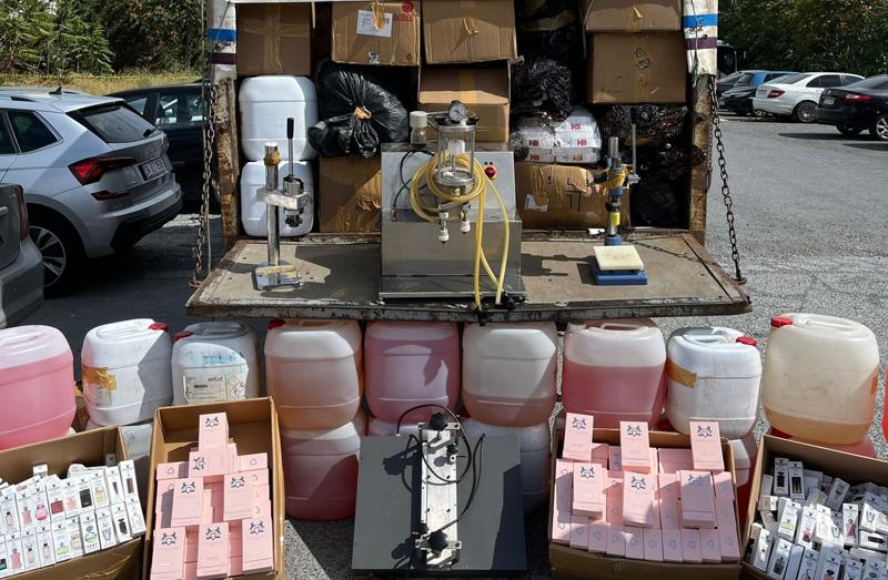 Polis, adreste farklı markalarda satışa hazır 5 bin 65 şişe sahte parfüm, 1 parfüm şişesi doldurma makinesi, 2 parfüm şişesi baskı makinesi, 250 litre parfüm yapımında kullanılan sıvı madde, 88 bin 500 etiket ve 126 bin 70 cep parfüm kutusu ele geçirildi.