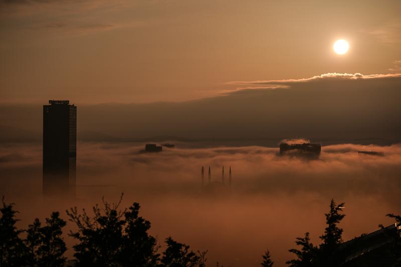 Kentte etkili olan sis nedeniyle yüksek katlı binaların üst kısımları görünmez hale geldi.
