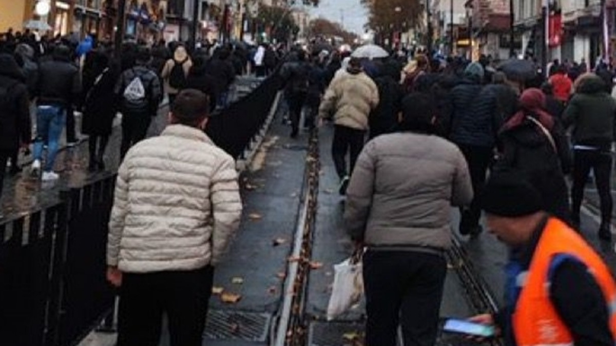Yolcularla birlikte tramvay yolunda yürüyen bir kişi, bu anları cep telefonuyla kaydetti.