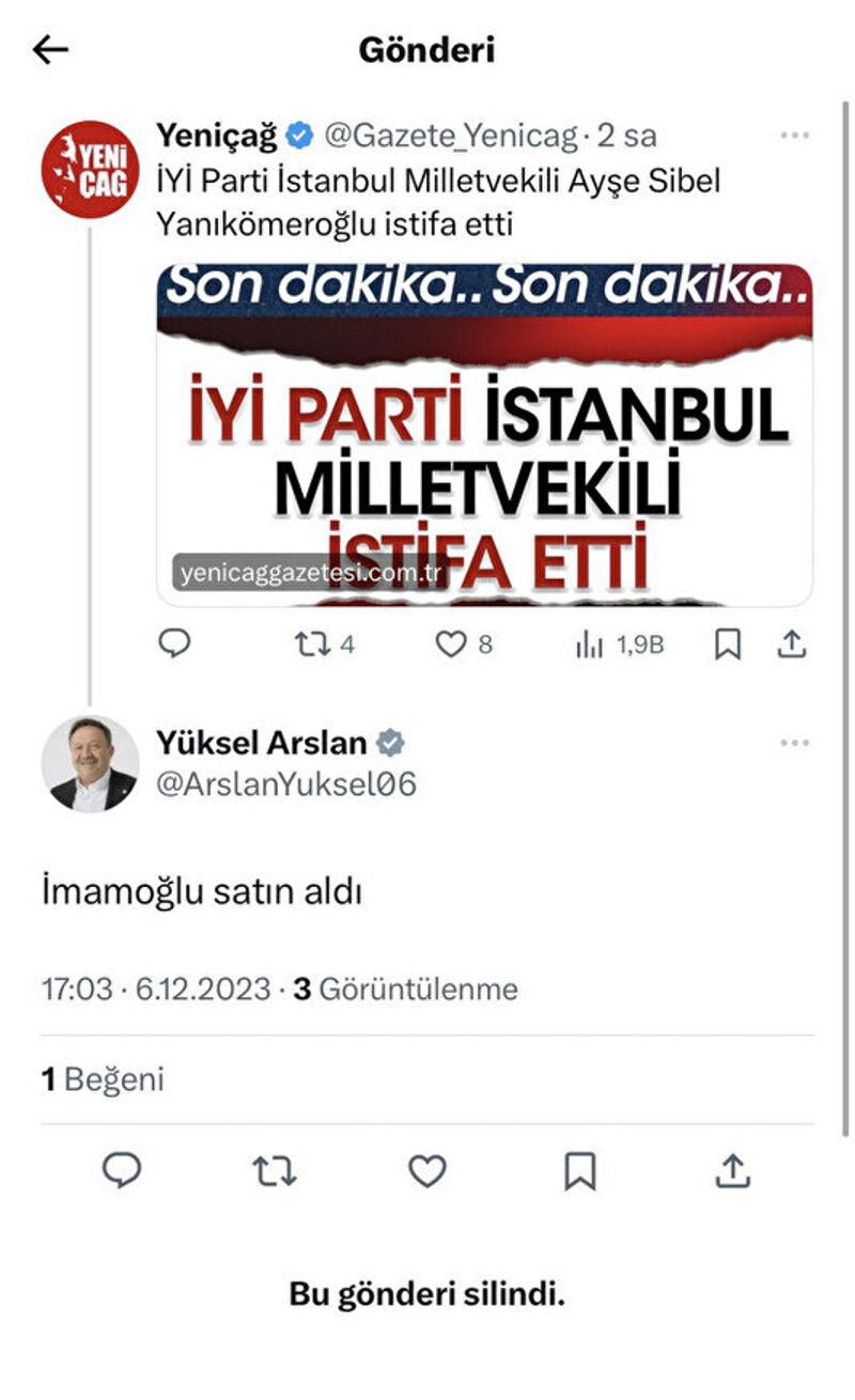 Yanıkömeroğlu'nun istifa etmesinin ardından, İYİ Parti Ankara Milletvekili Yüksel Arslan'ın sosyal medya hesabı üzerinden yaptığı bir yorum dikkat çekti.
