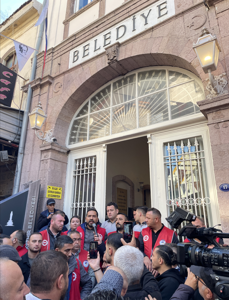 Kemeraltı Çarşısı'ndaki İzmir Büyükşehir Belediye binası önünde toplanan İZENERJİ çalışanları, 3'üncü gününde iş bırakma eylemini sürdürüyor.