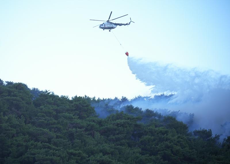 Yamanlar Karatepe mevkisinde önceki gün ormanlık alanda çıkan ve yerleşim yerleri ile sanayi sitesine sıçrayıp 3 mahallenin de boşaltılmasına neden olan yangına, günün ağarmasıyla ekipler havadan müdahale etmeye başladı.