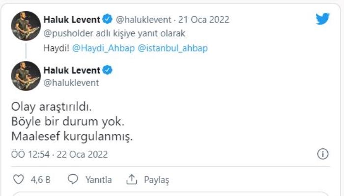Sosyal medyada çiftin paylaşıldığı bir videonun altına yorum yapan Haluk Levent, "Olay araştırıldı. Böyle bir durum yok. Maalesef kurgulanmış." dedi.