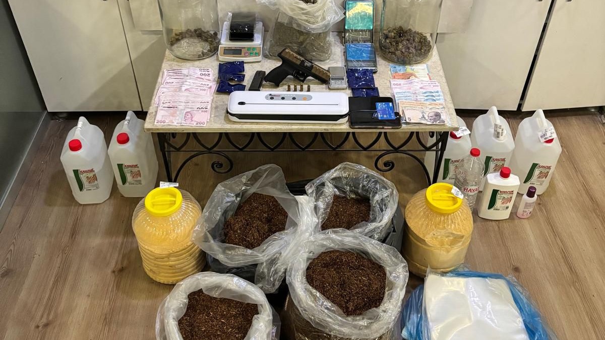 Hazırlıklarını tamamlayan polis ekipleri, adrese operasyon düzenledi. Baskında evde bulunan iki şüpheli muhafaza altına alınırken, yapılan aramalarda piyasa değeri yaklaşık 3 milyon lira olan 24 kilogram bonzai, 680 gram marihuana, 5 kilogram AM2205 maddesi ve yarım litre metamfetamin ele geçirdi. Devam eden aramalarda ise ruhsatsız tabanca, uyuşturucu madde ticaretinden elde edilen 14 bin 335 lira, 60 Euro, uyuşturucu madde paketlemesinde kullanılan vakumlama cihazı, 4 adet hassas terazi, çok sayıda klipsli poşet, 3 adet alüminyum folyo ve 2 adet çalıntı plaka buldu.