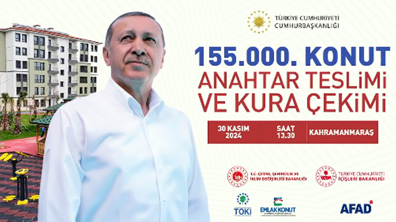 Kahramanmaraş'ta 30 Kasım Cumartesi günü Cumhurbaşkanı Reep Tayyip Erdoğan'ın katılımıyla 155 bininci konutun teslim töreni gerçekleştirilecek.