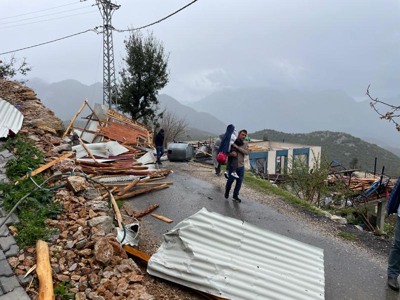 Büyükşehir ve Andırın belediyelerinin ekipleri, uçan çatı parçalarını toplamak ve sağanak nedeniyle bölgede biriken suyu tahliye etmek için çalışma başlattı.