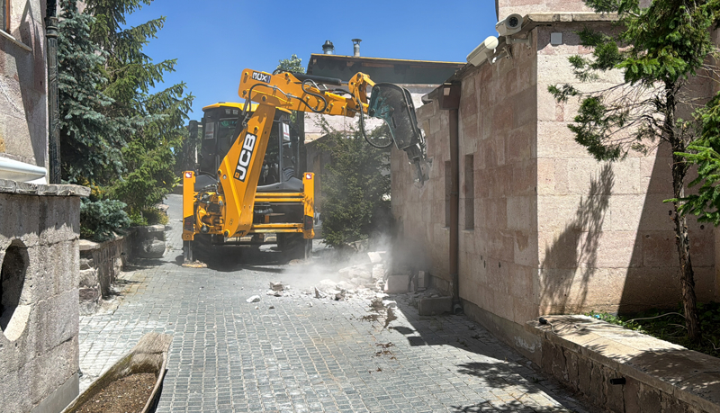 Merkeze bağlı Uçhisar beldesinde faaliyet gösteren otelin izinsiz ve ruhsatsız yapılan eklentisi, Başkanlık ekiplerince yıkıldı.