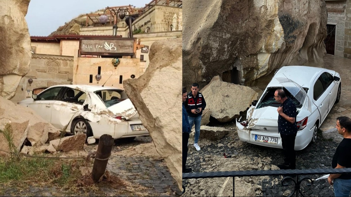 KAYALAR ARABALARIN ÜZERİNE DÜŞTÜKısa sürede şiddetini artıran yağış sele neden oldu. Sel nedeniyle cadde ve sokaklar suyla dolarken, bazı otomobiller peribacalarından düşen kaya parçaları nedeniyle zarar gördü.