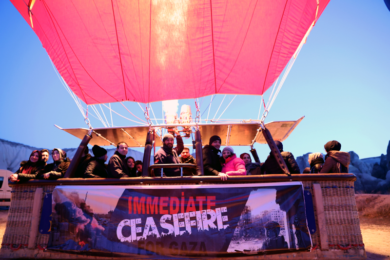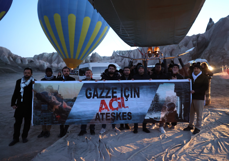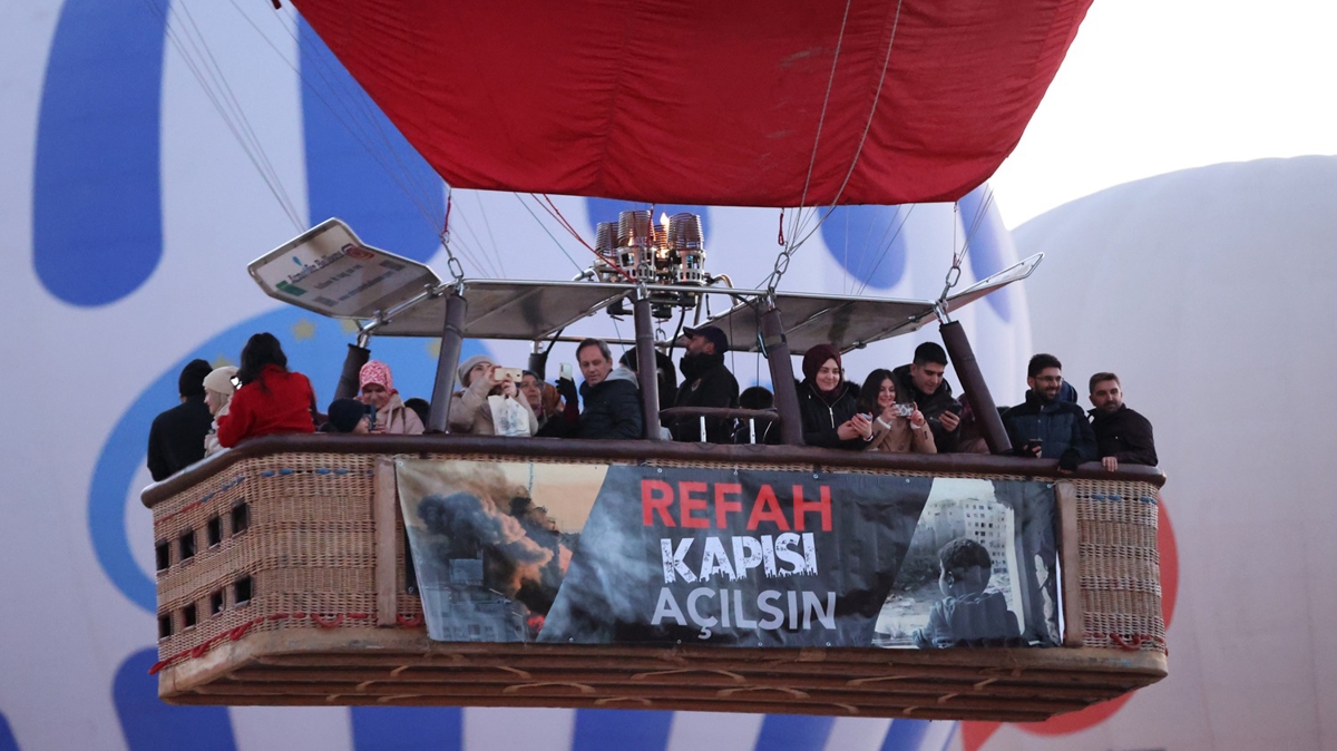 Kapadokya'da turistlere yönelik tur hizmeti veren sıcak hava balonlarının bazılarının sepetlerine, Türkçe ve İngilizce "Gazze'de acil ateşkes" ve "Refah Kapısı açılsın" yazılı afişler asıldı.