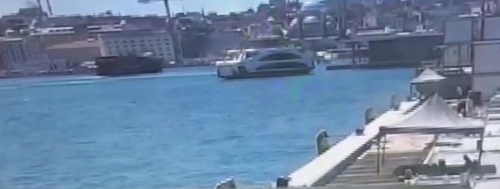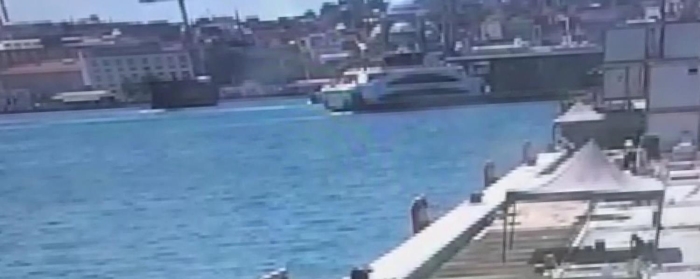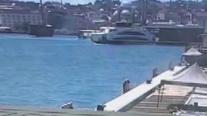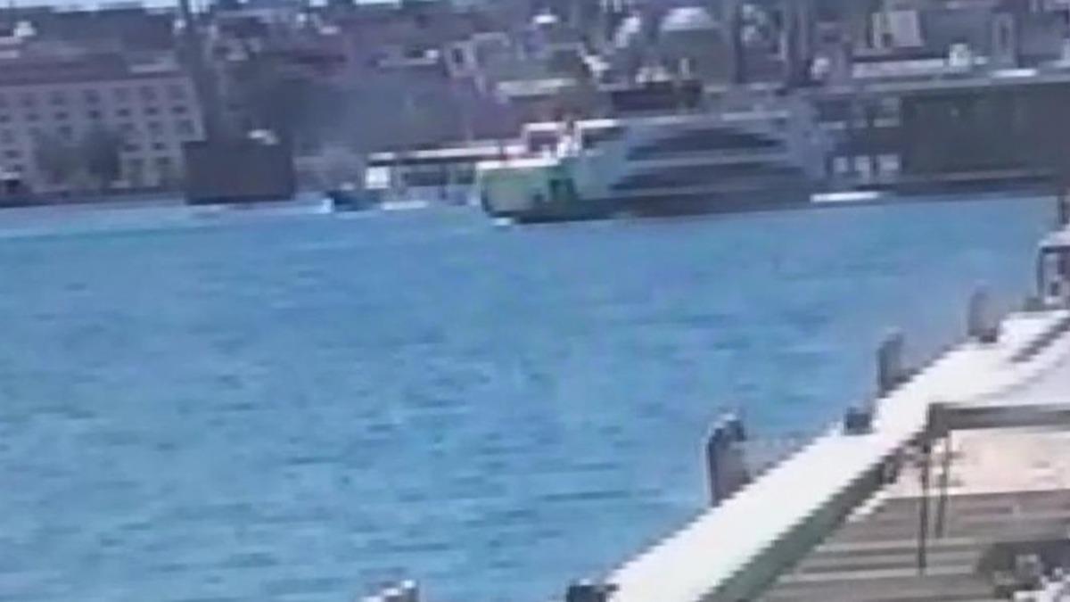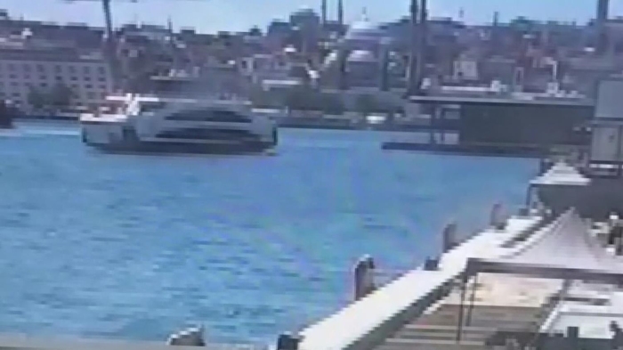 Görüntülerde, vapurun iskeleye çarptıktan sonra geriye savrulduğu görülüyor.