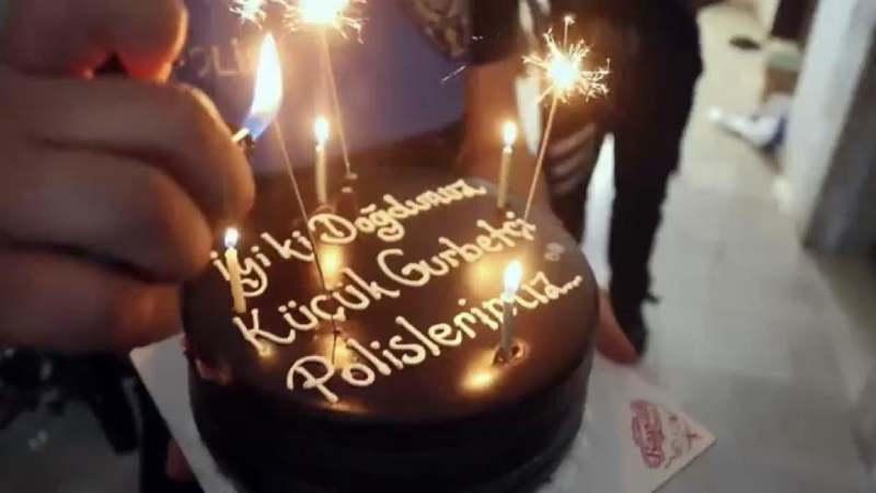 Pasta mumlarını üfleyen Özen, daha sonra kendisine hediye edilen polis gömleği ve şapkasıyla ekip aracına binip gezdi.